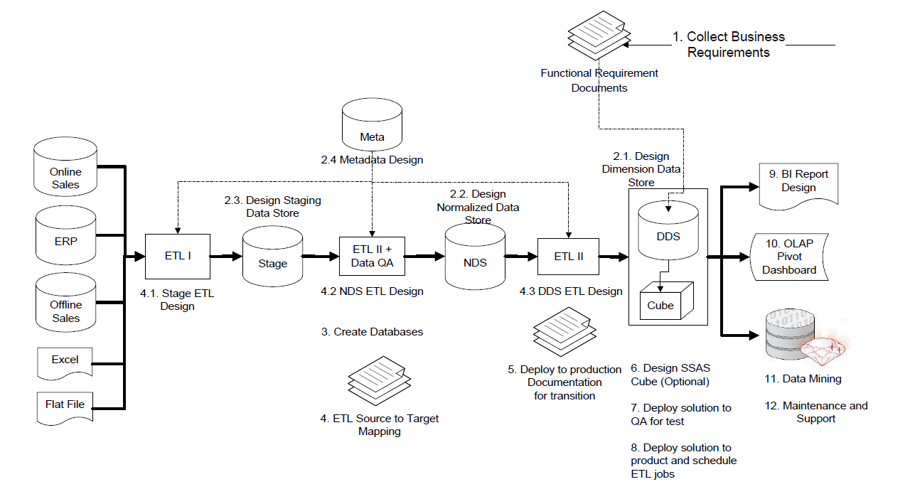 The above picture shows the overall task flow of a Data Warehouse | Business Intelligence project based on a hybrid approach.